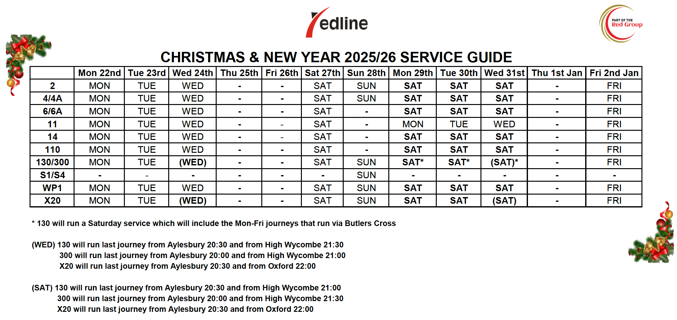 All services will operate a Saturday timetable. 130 & 300 journeys will still operate the normal Mon - Fri journeys via Butlers Cross. The following services will finish early: