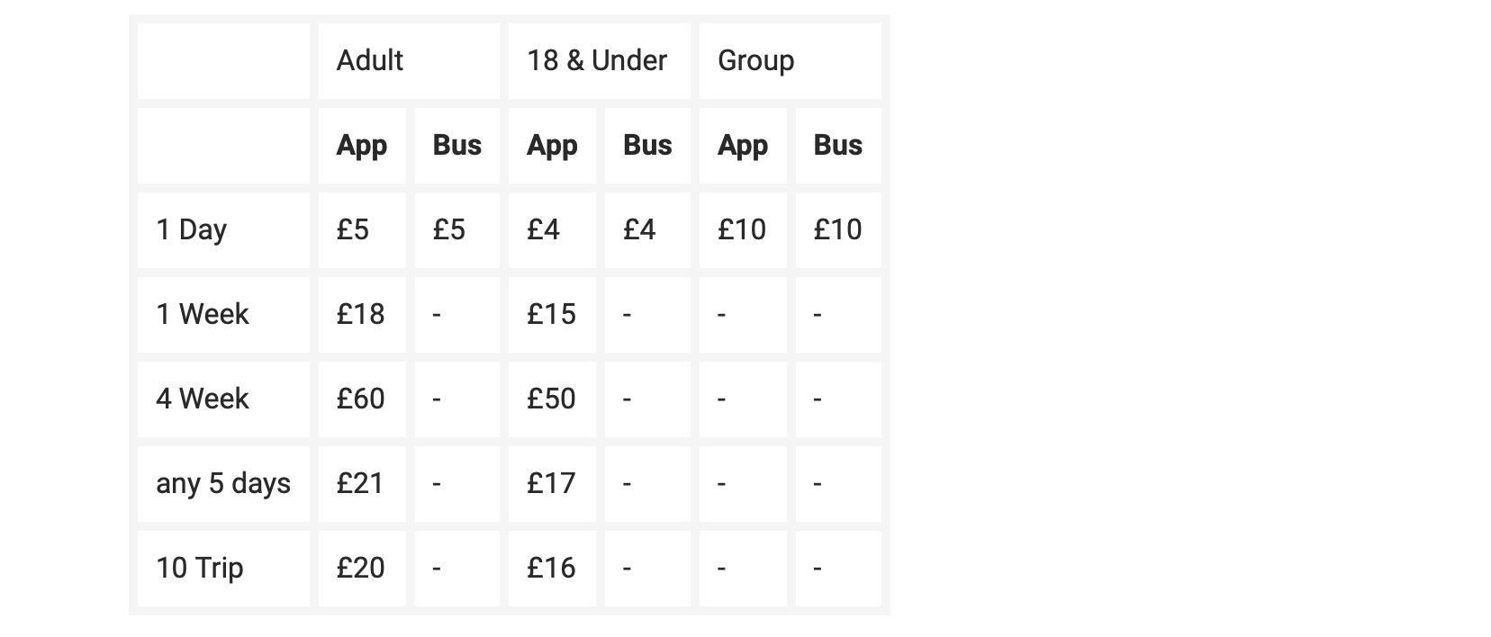 Prices for each ticket can be found below: